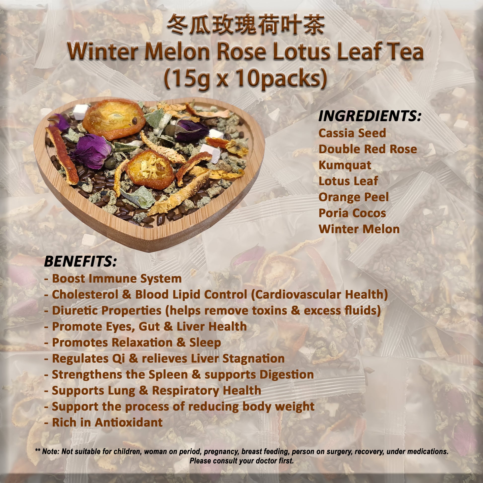 Ingredients: Cassia seed, Rose Bud, Kumquat, Lotus leaf, Orange Peel, Poria cocos, Winter melon